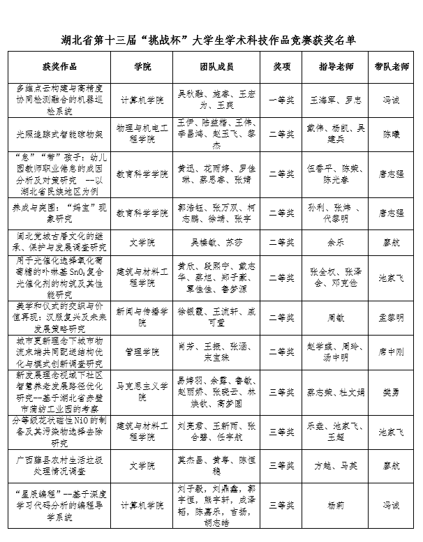本网讯(通讯员 张静)5月19日下午,湖北省第十三届“挑战杯·中国银行”大学生课外学术科技作品竞赛落下帷幕。经过激烈角逐,我校获一等奖一项、二等奖七项、三等奖四项,其中一等奖作品入围“挑战杯”国赛。学校获“优胜杯”。