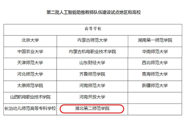 本网讯(通讯员 陈婧)9月8日,教育部公布了第二批人工智能助推教师队伍建设试点地区和高校,湖北省有两所高校入选,我校为唯一一所入选的省属高校。