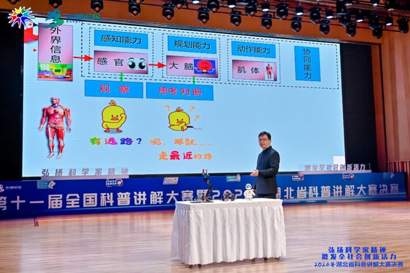 比赛中,万振武以“类人的机器不累人”为题,进行了4分钟的科普讲解。他以实际教学工作中设计的机器人为例,进一步具象化机器人的各种智慧能力,不仅加深了观众对机器人的感性认识,同时对系统的理论知识进行了很好的科学普及。